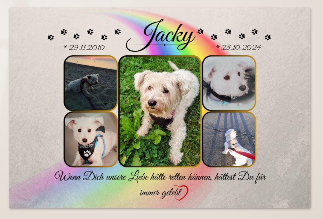 Deine individuelle Fotoleinwand, gestaltet mit dem Bild deines geliebten Haustiers, seinem Namen, wichtigen Informationen, Geburts- und Sterbedatum sowie einem berührenden Trauerzitat.