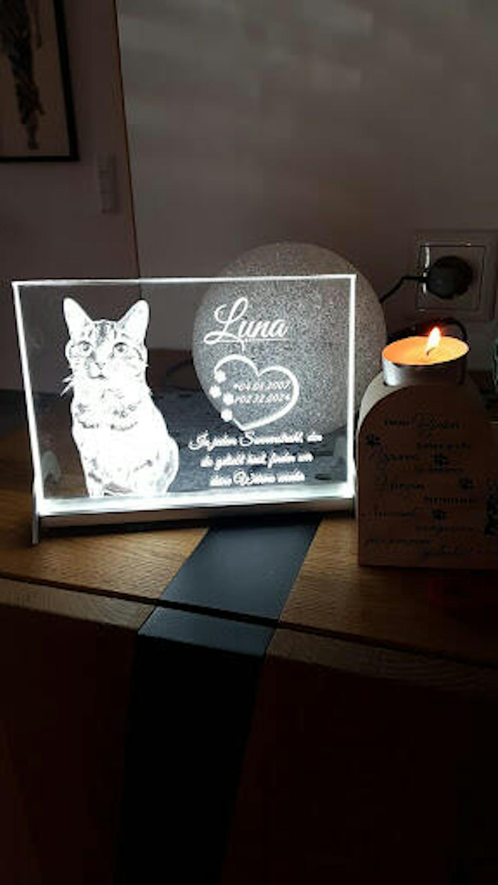 Individuell gestaltbar mit deinem Lieblingsfoto, persönlichem Text und den Daten deines verstorbenen Haustieres, eingraviert in edlem und hochwertigem Kristallglas. Elegante LED-Beleuchtung im Aluminiumständer setzt es stilvoll in Szene